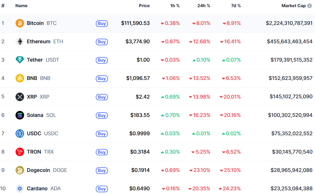 На момент написання новини ціна першої криптовалюти становить $111 590, Ethereum — $3 774.