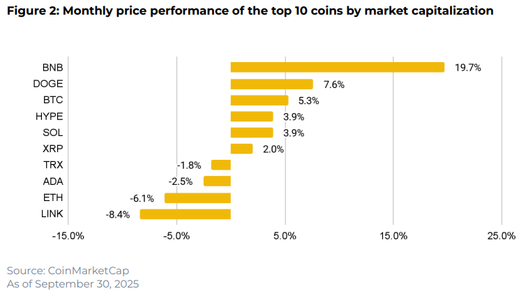 Серед топових активів за місячними результатами вирізнилися BNB (+19,7%), DOGE (+7,6%) і BTC (+5,3%). Ріст BNB підтримали рекордні обсяги торгів на Aster DEX і розширення платформи Benji Investments від Franklin Templeton у мережі BNB Chain.