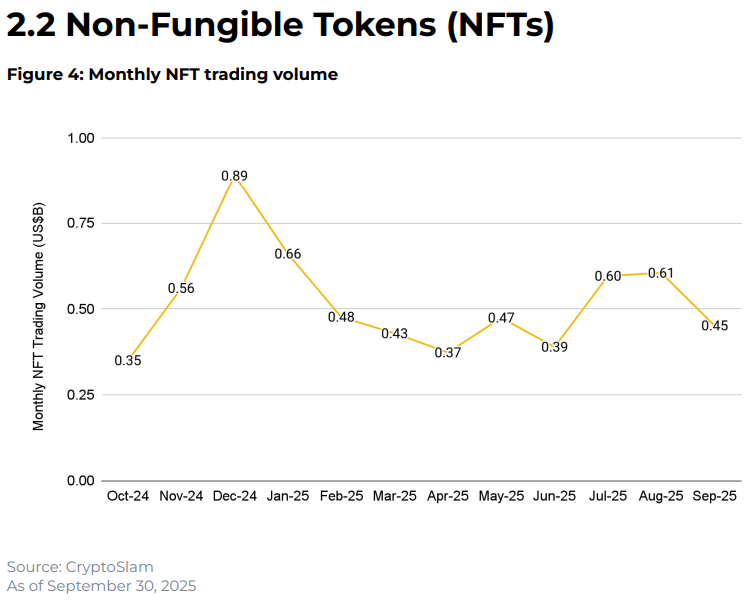 Ринок NFT скоротився на 25,5% порівняно з серпнем. Обсяги торгів на Ethereum знизилися на 54,8%, на Polygon — на 54,6%, у BNB Chain — на 72%. Серед колекцій лідером стала Courtyard (Polygon), що посіла перше місце у світовому рейтингу. Другу позицію зайняла DMarket (Mythos). Після airdrop привернув увагу новий проєкт Hypurr NFT, де середня ціна floor price сягнула $50 000.