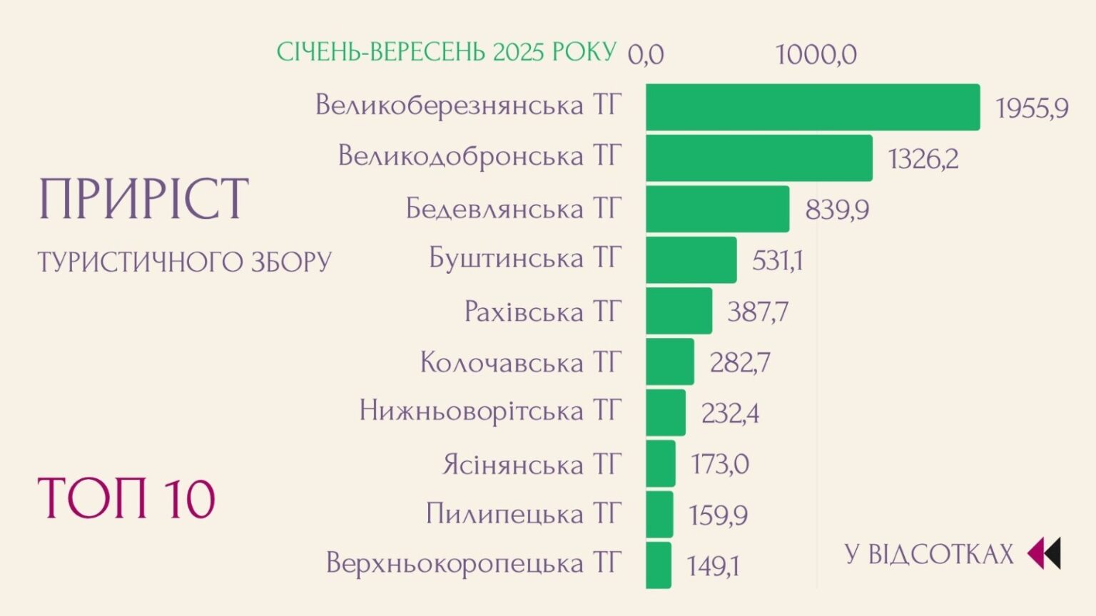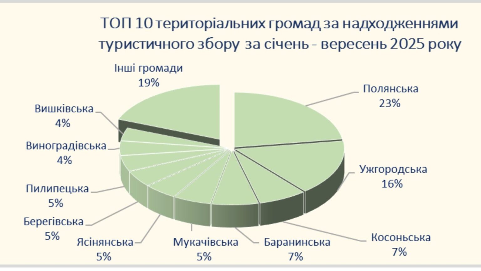 За 9 місяців 2025 року до місцевих бюджетів Закарпатської області сплачено 21 млн 170 тис. грн туристичного збору, що на 40% більше аналогічного періоду 2024 року. Про це повідомили в управлінні туризму та курортів Закарпатської ОВА.