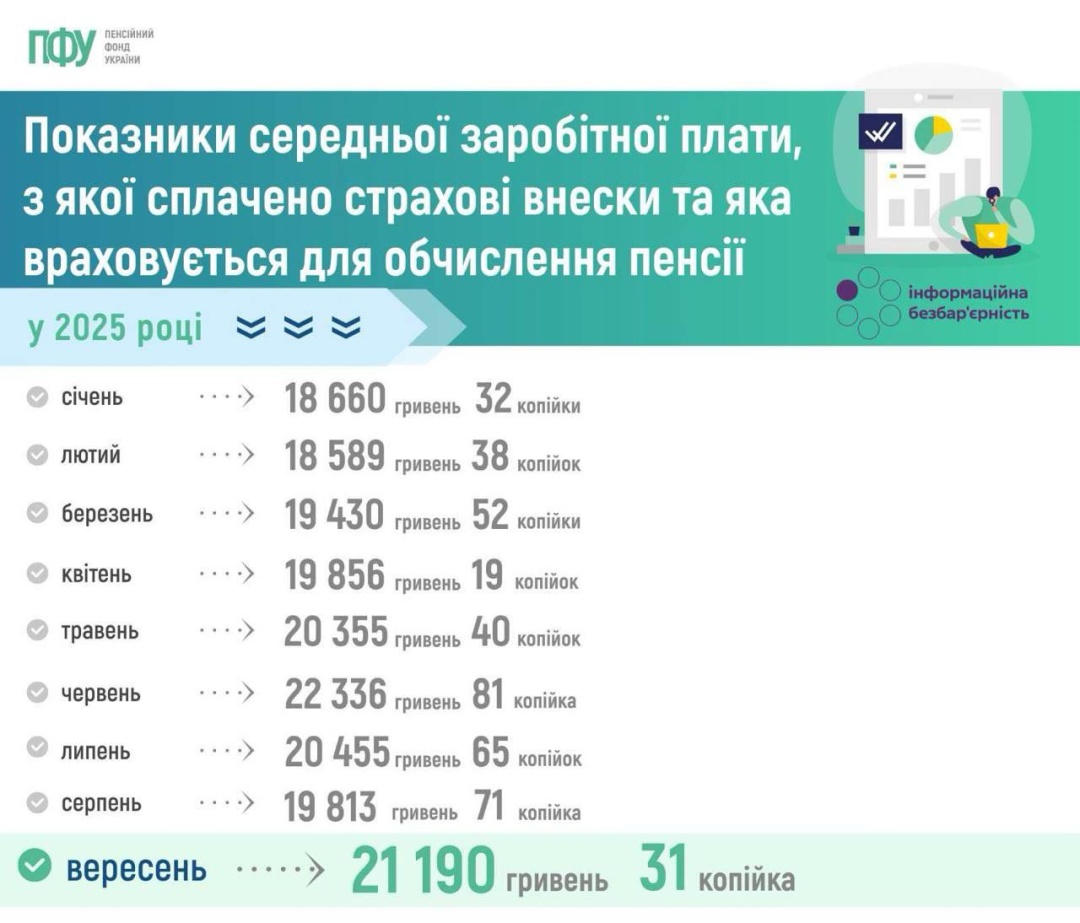 «27 жовтня 2025 року затверджено показник середньої заробітної плати (доходу) в Україні, з якої сплачено страхові внески та яка відповідно до Закону України „Про загальнообов’язкове державне пенсійне страхування“ враховується для обчислення пенсії, за вересень 2025 року. Він становить 21 190 гривень 31 копійка», — йдеться у повідомленні.