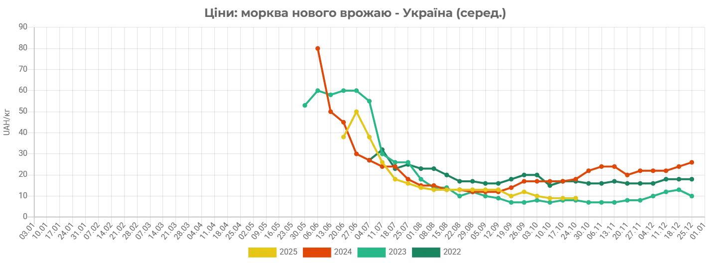 Незважаючи на поточне зростання, аналітики зазначають, що морква в Україні все ще продається в середньому на 54% дешевше, ніж була зафіксована ціна за аналогічний період минулого року.