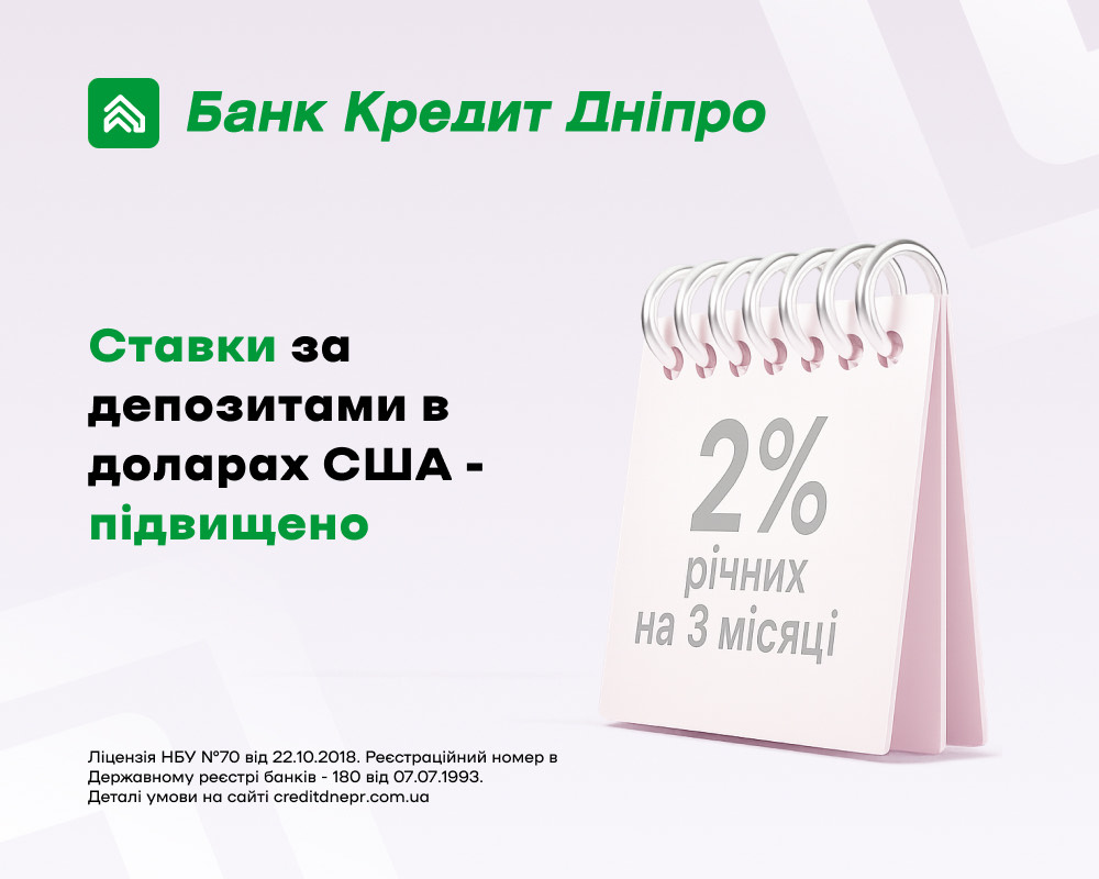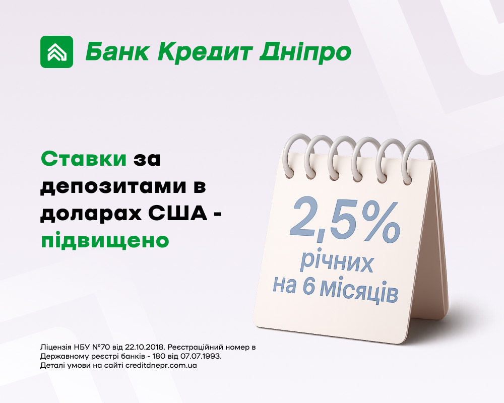 Банк Кредит Дніпро пропонує 2,5% річних за вкладами в доларах США для фізичних осіб строком на 6 місяців та 2,0% річних — на 3 місяці. Наразі це одна з найвигідніших ставок у доларах США серед банків України.