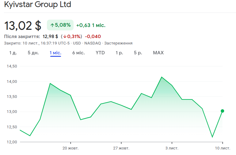 Акції Kyivstar на фондовій біржі NASDAQ зросли на 7% за день, демонструючи відновлення після падіння, яке розпочалося на початку листопаду.