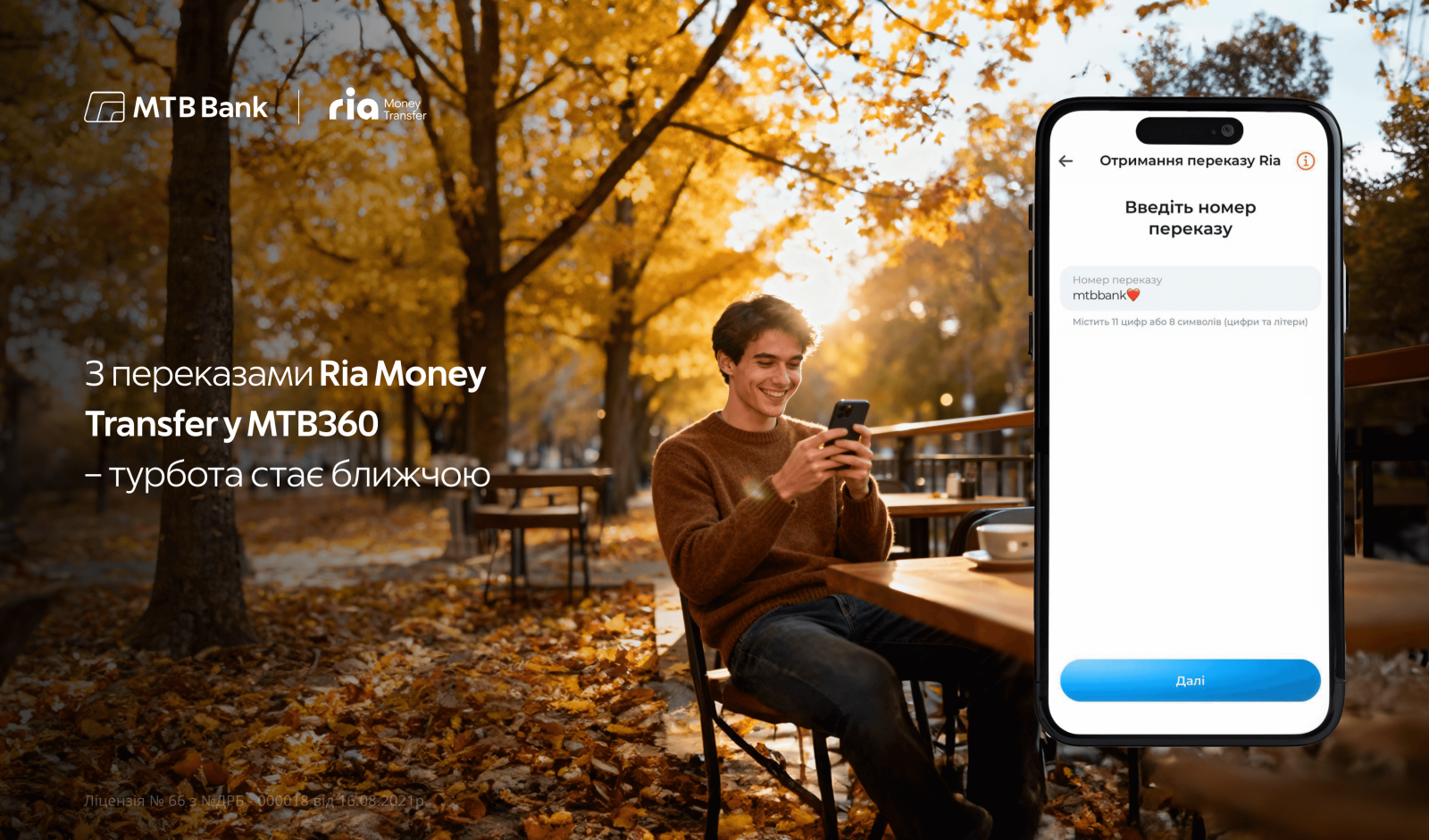 Тепер отримати міжнародний переказ через RIA Money Transfer можна просто в застосунку МТВ360 від МТБ Банку — без відділень і без черг.
