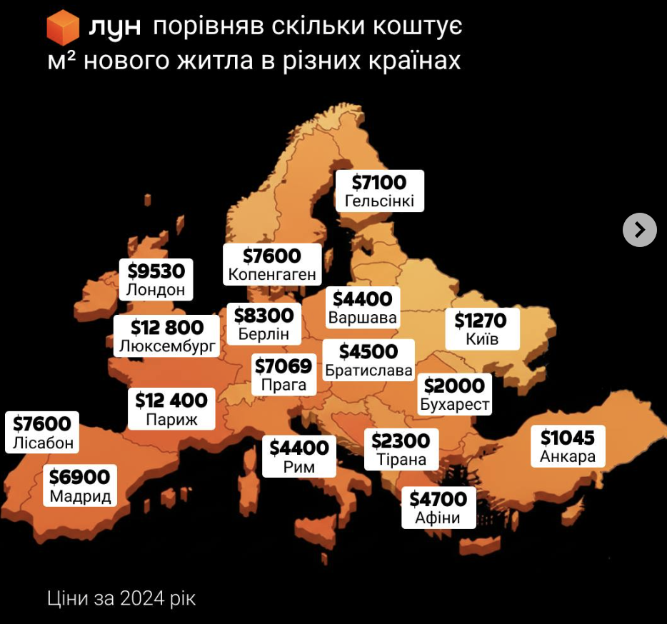 Порівняння європейського ринку показує, що різниця між Києвом і провідними столицями ЄС сягає 5−10 разів. За даними ЛУН, у 2024 році ціни на нове житло у топових європейських столицях були такими: