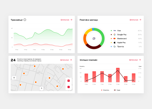 Сервіс робить акцент на адаптивній платіжній сторінці (автоматично підтягує методи оплати та мови), підтримці міжнародних платежів і валют, а також сучасних методах оплати, на кшталт Apple Pay/Google Pay чи банківських карток. Важлива деталь — мерчант-портал із наскрізною аналітикою в реальному часі, де видно статуси оплат, звіти, нараховану комісію та графік відшкодувань на банківську картку або рахунок.