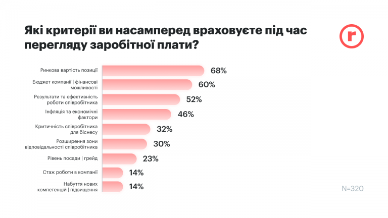 Роботодавці також зважали на критичність позиції для бізнесу (32%), розширення зони відповідальності (30%), рівень посади (23%), стаж у компанії (14%) і здобуття нових компетенцій (14%).