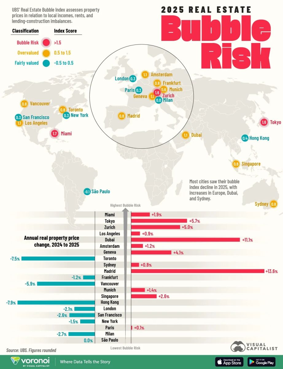 Нижче наведено повний рейтинг міст за 2025 рік за індексом Bubble Index від UBS, а також щорічну зміну реальних цін: