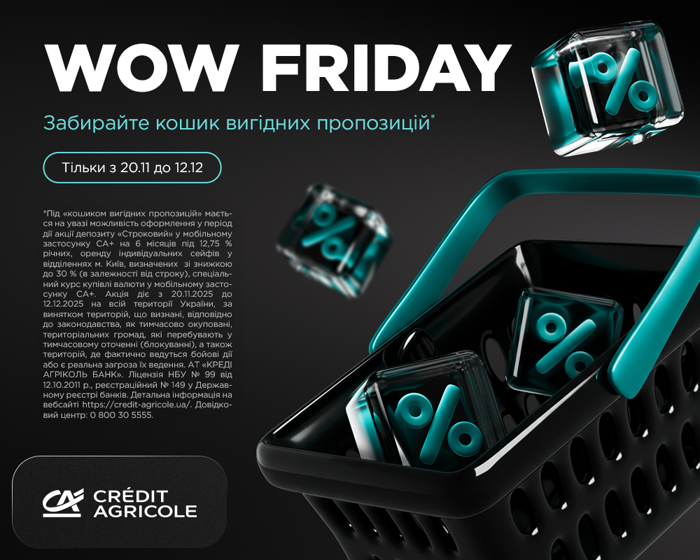 Креді Агріколь зустрічає Чорну п’ятницю масштабною акцією WOW Friday, яка триває з 20 листопада до 12 грудня. Пропозиції спрямовані як на нових, так і на чинних клієнтів, і роблять акцент на транзакційному бізнесі — валютних операціях, користуванні картками за кордоном та розміщенні депозитів.