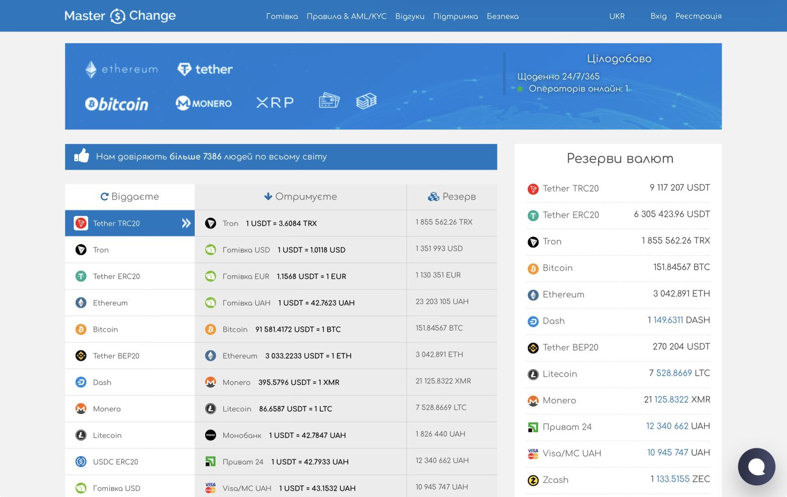 MasterChange на ринку з 2014 року і належить до сервісів, які одними з перших почали надавати українцям можливість швидко обмінювати криптовалюту на фіатні гроші. За понад десять років роботи платформа вибудувала стабільну репутацію, що підтверджується відгуками клієнтів із України, Європи та США. Сервіс підтримує популярні активи, включно з USDT у мережах TRC20 та ERC20, BTC, ETH, LTC, TRX, Monero, Dash та USDC, що дозволяє виконувати обміни у найпоширеніших напрямках.