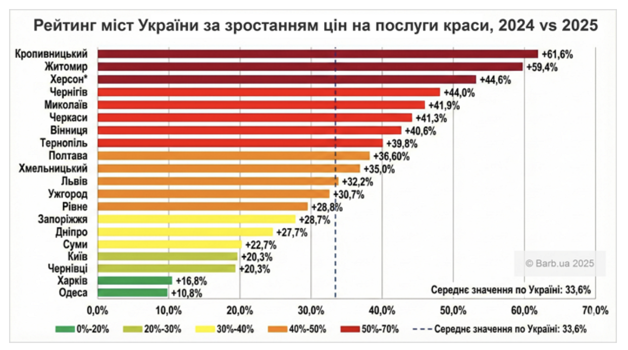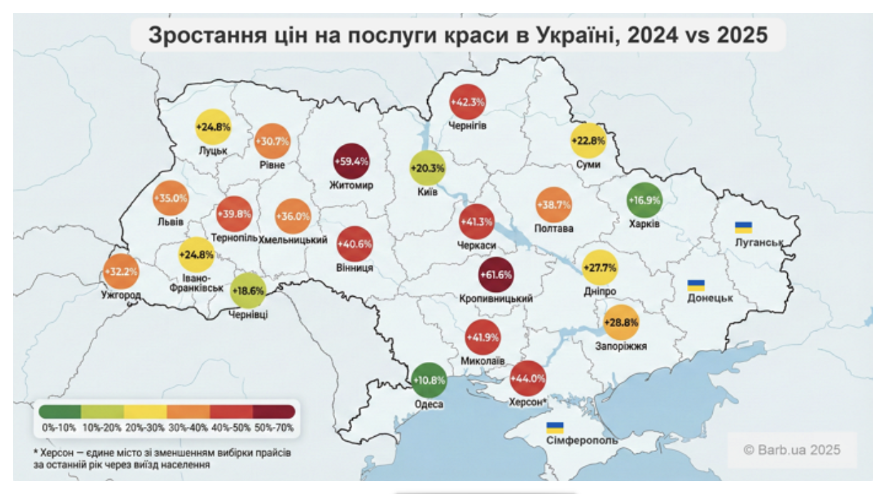 Середнє подорожчання послуг у сфері краси та косметології в Україні за рік склало 33,6%, що суттєво перевищує офіційний індекс споживчих цін на послуги. Такі дані наводить аналітичний звіт платформи Barb.ua, який базується на аналізі 260 тисяч прайс-позицій від салонів краси та приватних майстрів у 22 обласних центрах країни за період осінь 2024 — осінь 2025.