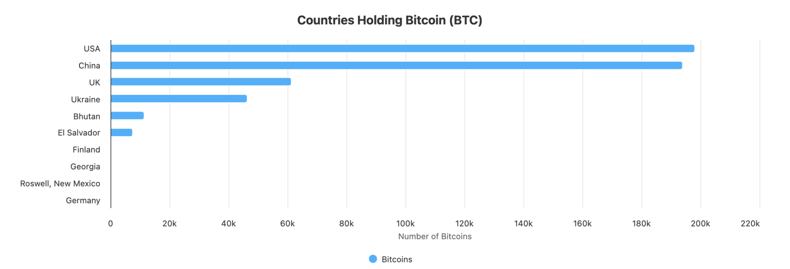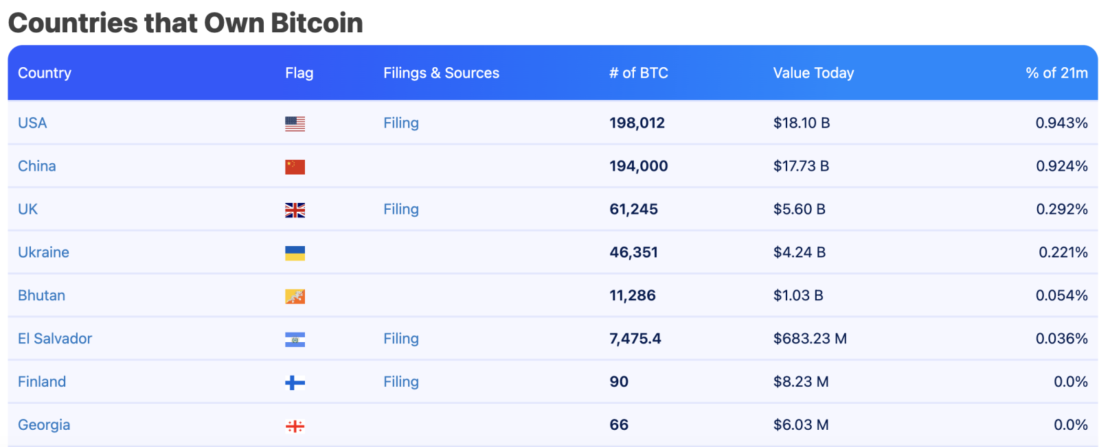 Першу позицію рейтингу займають Сполучені Штати Америки з резервом у 326 500 біткоїнів, що становить приблизно $28 млрд.