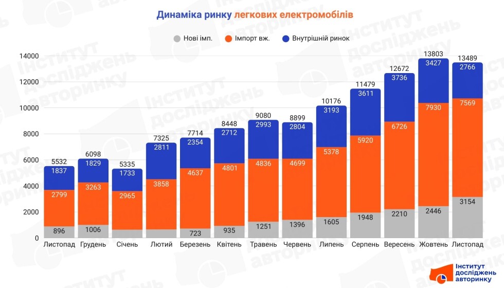Ринок легкових електромобілів в Україні у листопаді 2025 року продемонстрував історично високі показники. Сумарний обсяг сегмента склав 13,5 тис. автомобілів. Хоча це на 2,3% менше, ніж у жовтні 2025 року, річний приріст є феноменальним — обсяг зріс на 143,8% порівняно з листопадом 2024 року. Про це повідомляє Інститут досліджень авторинку.
