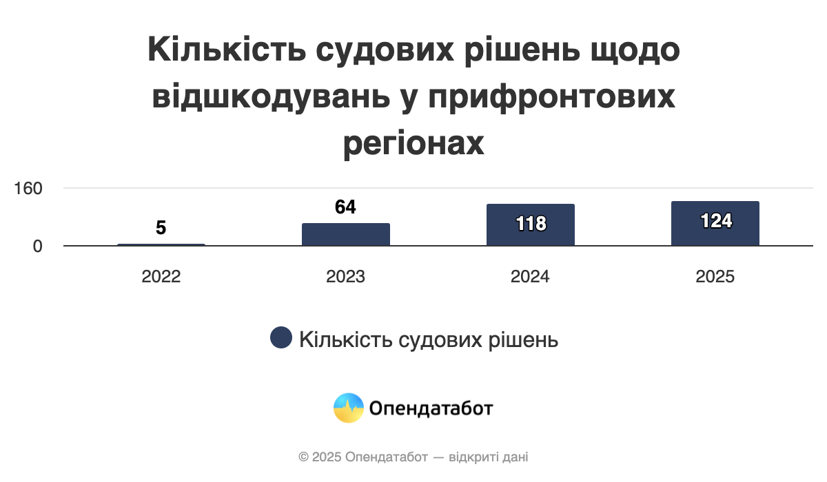 У 2022 році було ухвалено лише 5 таких рішень, втім вже за рік їх кількість зросла удесятеро. А за неповний поточний рік суди вже винесли 124 рішення. Разом із кількістю зростають і суми вимог.