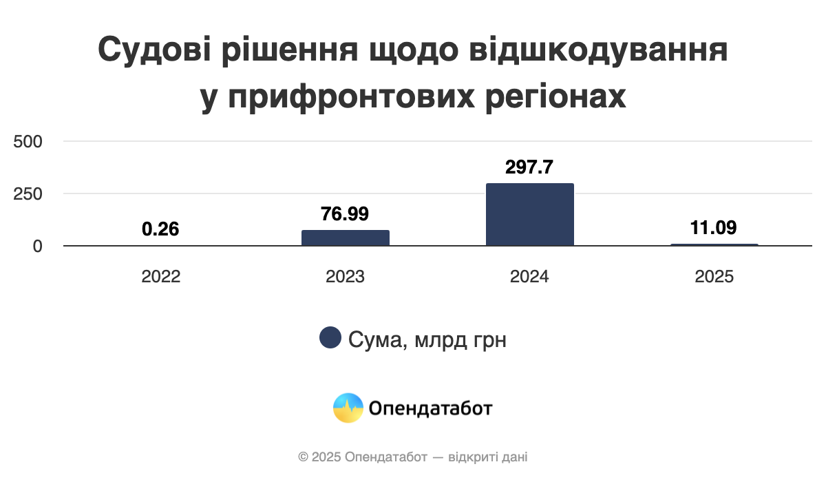 Так, у перший рік повномасштабної бізнесу присудили компенсувати лише 260 млн грн, а вже у 2023-му сума рішень судів зросла до майже 77 млрд грн. Абсолютний пік припав на 2024 рік — понад 297 млрд грн. Цьогоріч сума рішень знизилась до 11 млрд грн.