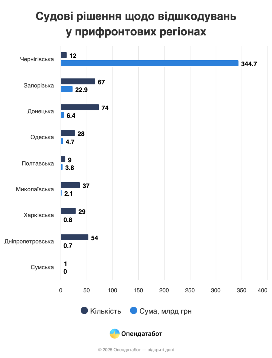 Від початку повномасштабного вторгнення українські суди все частіше ухвалюють рішення про стягнення збитків з росії на користь бізнесу. Лише у прифронтових областях за цей час винесено 311 рішень на загальну суму понад 386 млрд грн. Це половина від загальної кількості рішень у подібних справах у судах.