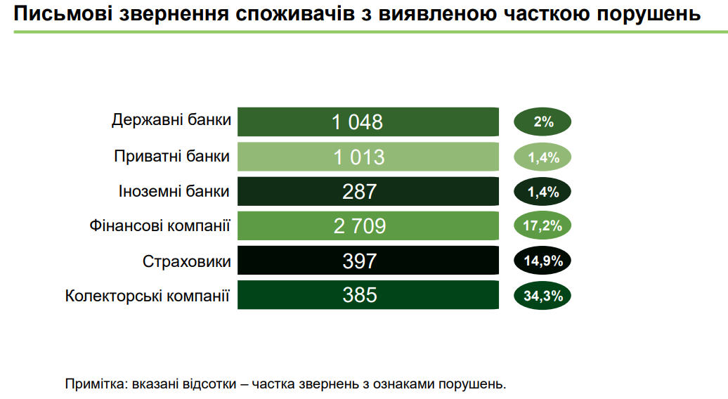 Частка звернень з ознаками порушень у державних банках становила 2%, а у приватних та іноземних банках — по 1,4%.