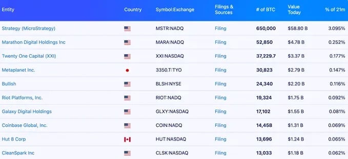 Першу позицію займає Strategy, під керуванням якої знаходиться 650 000 BTC, це 3% від емісії біткоїну. У трійку лідерів увійшли MARA Holdings та Twenty One Capital — 52 850 BTC і 37 229 BTC відповідно.