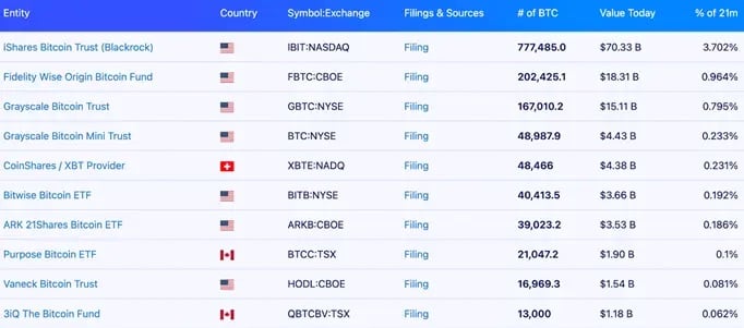 Біржові фонди (ETF) сконцентрували 1,31 млн. BTC. Більшість пропозиції знаходиться у iShares Bitcoin Trust керуючої компанії BlackRock — 777 485 BTC.