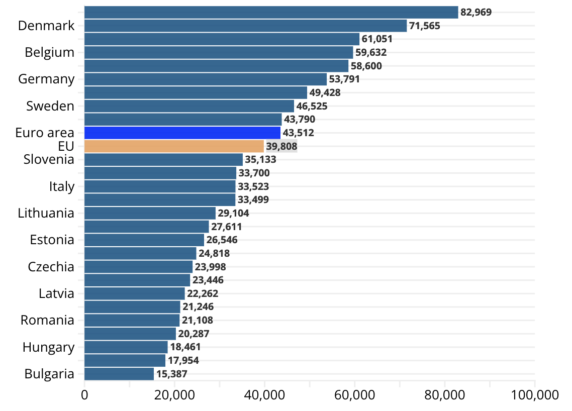 Окрім Люксембургу, середня зарплата перевищує 50 000 євро ще у п'яти країнах: Данії, Ірландії, Бельгії, Австрії та Німеччині.