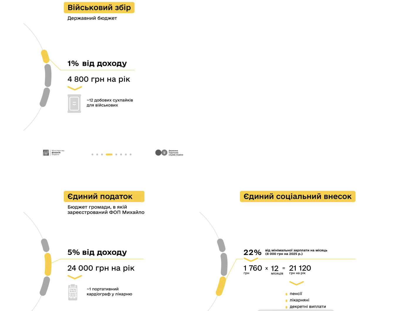 «27-річний Михайло — майстер плиточник. Свої замовлення він знаходить за оголошеннями в інтернеті та рекомендаціями від попередніх клієнтів. У середньому щомісяця Михайло заробляє близько 40 тис. грн (120 тис. грн/квартал; 480 тис. грн/рік). Для легалізації доходу, Михайло зареєстрував свою діяльність як ФОП (фізична особа-підприємець) 3 групи. Це дозволяє йому офіційно надавати послуги з укладання плитки як окремим громадянам, так і співпрацювати з будівельними компаніями.