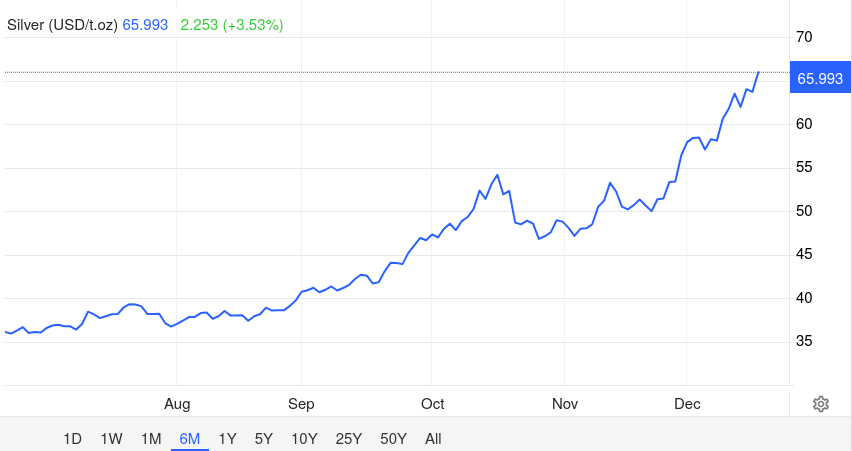 Срібло стало безумовним лідером ринку. Після досягнення піку ціна скорегувалася до $65,94 (+3,4% за сесію). З початку року метал подорожчав на вражаючі 128%.