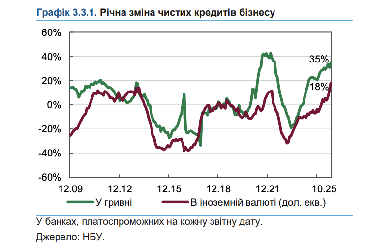За словами Ніколайчука, банки активно кредитують підприємства різних розмірів, форм власності та галузей. Завдяки цьому щорічне зростання чистих гривневих кредитів бізнесу прискорилося до 35%.