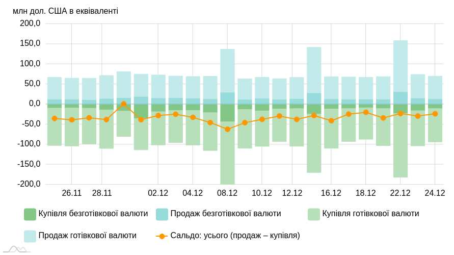 Наймлявішими були торги у четвер, 25 грудня, коли США та Європа відзначали Різдво та західні банки практично не працювали. Україна в умовах війни працювала, хоча практично всі клієнти теж відпочивали і загальний обсяг операцій за системою Блумберг навіть не дотягнув і до $100 млн. У решту днів компанії активно закривали свої зовнішньоекономічні операції перед кінцем року і статистика операцій перевищувала щонайменше удвічі обсяги операцій святкового четверга.