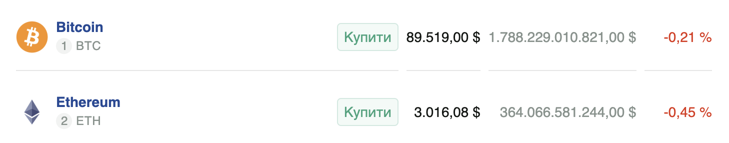 На момент написання, згідно з даними інтерактивної карти «Мінфіну», цифрове золото торгується за $89 519, ефір — за $3011.