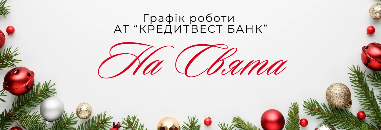 Банку інформує, що в період Різдвяних та Новорічних свят АТ «Кредитвест Банк» працюватиме: