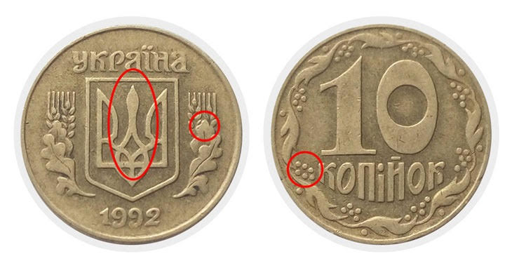 Монета в 10 копійок 1992 року була викарбувана великим тиражем із різними типами штампів, що дало понад 30 її різновидів. А найрідкісніші варіанти коштують у нумізматів десятки тисяч гривень.