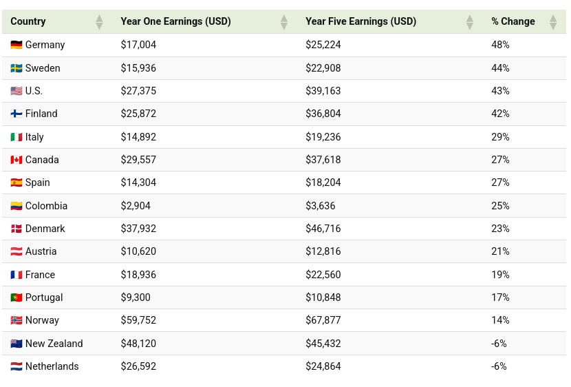 Адаптація до нового ринку праці зазвичай позитивно впливає на гаманець мігранта. У міру того як іноземці здобувають місцевий досвід та інтегруються, їхні статки зростають. Абсолютним лідером за темпами цього зростання стала Німеччина. Тут річний дохід мігранта за перші п'ять років роботи збільшується в середньому на 48% — з $17 004 до $25 224.