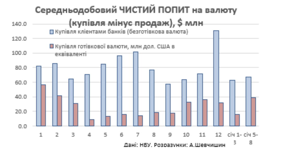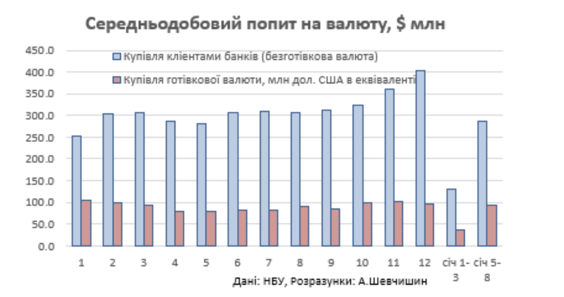 НБУ опублікував дані по середньодобовому попиту на валюту на міжбанку та готівковому ринку за період з 1 по 8 січня, що дозволяє подивитись на фактичні попит та пропозицію валюти на ринку, для того щоб оцінити чи був надмірний попит, який зрушив курс вище психологічних рівней. Про це в коментарі «Мінфіну» заявив фінансовий експерт Андрій Шевчишин.
