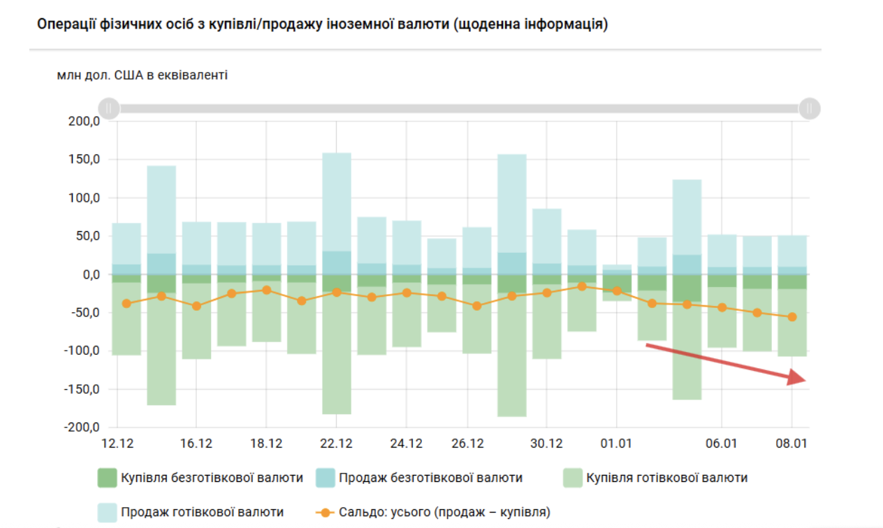 Середньдобовий чистий попит на готівкову валюту в 2025 році становив 26,3 млн дол, й за 4 кв 2025 — 33,5 млн дол. На цьому тижні бачимо цифри чистого готівкового попиту — 38,7 млн дол (+15,5% до 4 кв 2025). Тобто чистий готівковий попит дійсно виріс. Якщо подивитись на динаміку операцій фізичних осіб з купівлі-продажу валюти, добре видно як населення нарощує купівлю по мірі послаблення курсу, що є традиційною поведінкою в моменти зростання вартості валют.