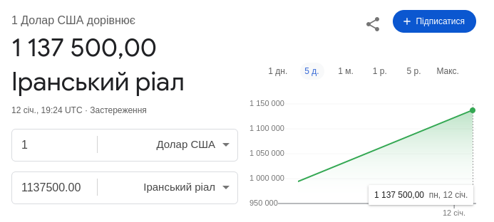 Фінансова ситуація в Ірані досягла критичної точки. Згідно з останніми котируваннями, національна валюта перетнула позначку в один мільйон одиниць за долар.