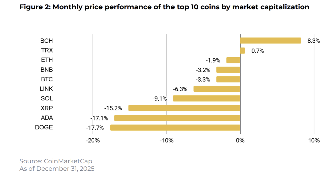 - DOGE (−17,7%) — найпомітніше зниження серед топ-10 активів у грудні.