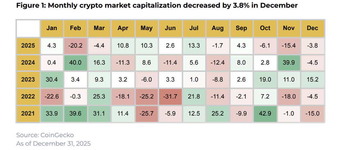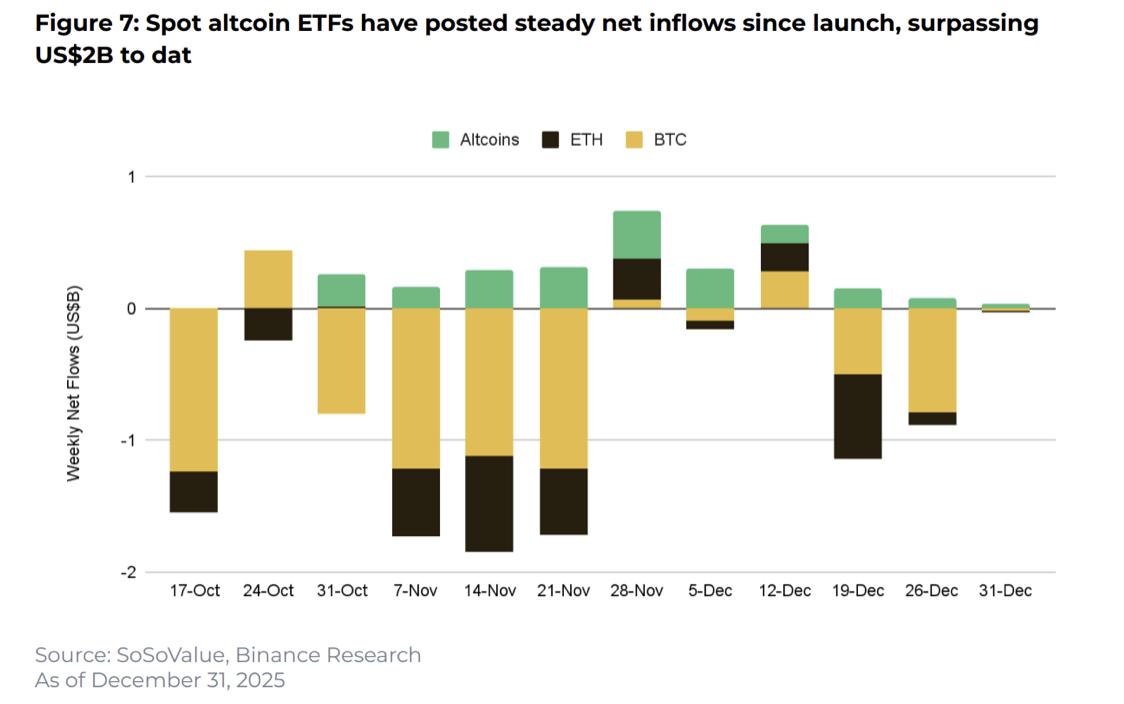 Binance Research зазначає, що грудень продовжив коригувальний імпульс, при цьому структура ринку стала більш «захисною»: домінування BTC і ETH зміцнилося, компанії-утримувачі цифрових активів продовжили накопичення, а динаміка ETF-потоків підсвітила диверсифікацію попиту на користь окремих альткоїнів через нові продукти.