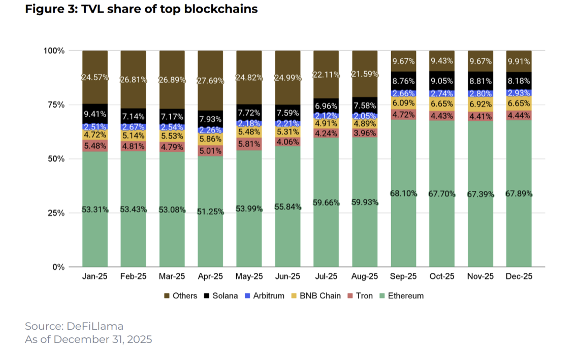 У грудні сегмент DeFi знизився помірно: Total Value Locked (TVL) скоротився на 1,76% м/м. У розрізі найбільших екосистем Binance Research відзначає зростання частки в окремих мереж (включаючи Ethereum, Tron і Arbitrum), тоді як у частини інших частка трохи знизилася.