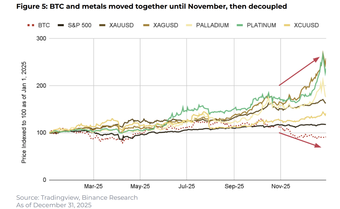 На цьому тлі Bitcoin у IV кварталі, за спостереженням команди, розійшовся з цією логікою через відсутність «Strategic Asset Premium» (підтримки на рівні суверенних рішень), яка зараз більшою мірою підпирає фізичні commodities.