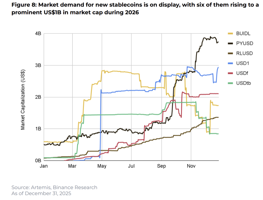У 2025 році одразу шість нових стейблкоїнів подолали позначку 1 млрд доларів капіталізації, але траєкторії зростання відрізнялися залежно від аудиторії та сценаріїв використання.