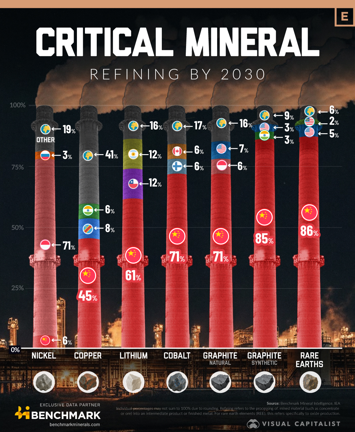 Єдиним мінералом, де Китай не утримує пальму першості, є нікель. Тут беззаперечним лідером стає Індонезія. Прогнозується, що до 2030 року ця країна контролюватиме 71,2% світової переробки нікелю, залишивши Китаю скромні 6,2%.