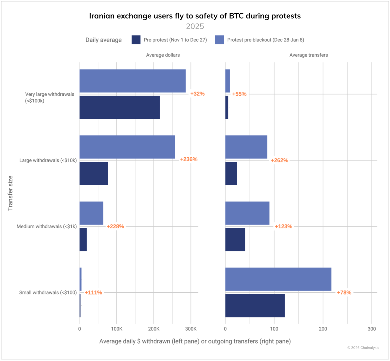 На тлі падіння іранського ріала (який знецінився на 90% з 2018 року) та інфляції у 40−50%, звичайні іранці масово переходять на біткоїн. Під час масштабних протестів наприкінці 2025 — на початку 2026 року зафіксовано аномальний сплеск виведення коштів з бірж на особисті (некастодіальні) гаманці.