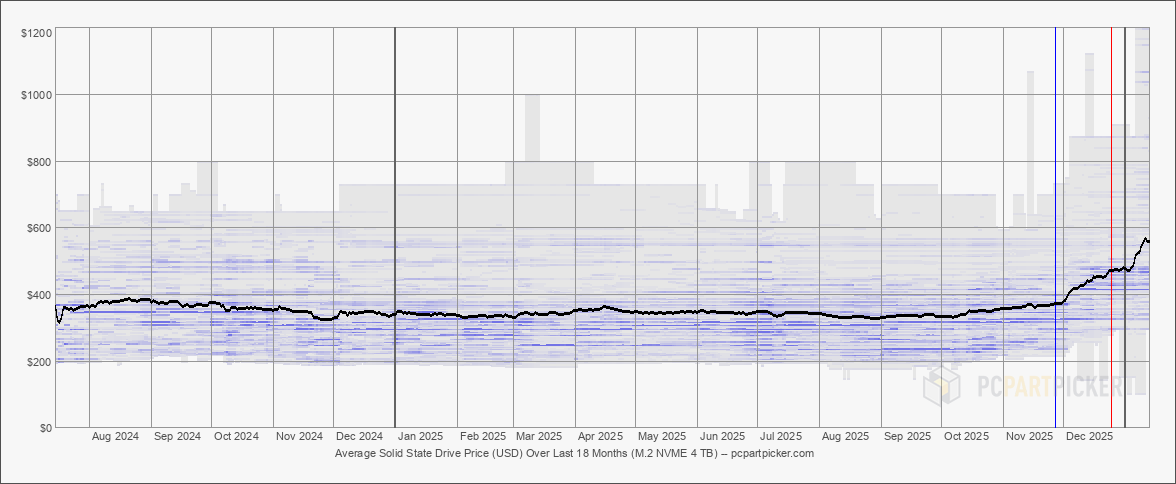 Графіки цінового трекера PCPartPicker показують «вертикальне» зростання вартості накопичувачів протягом останніх двох місяців. Сіра зона на графіках — розподіл цін — свідчить про те, що дешеві пропозиції зникають з ринку за лічені години.