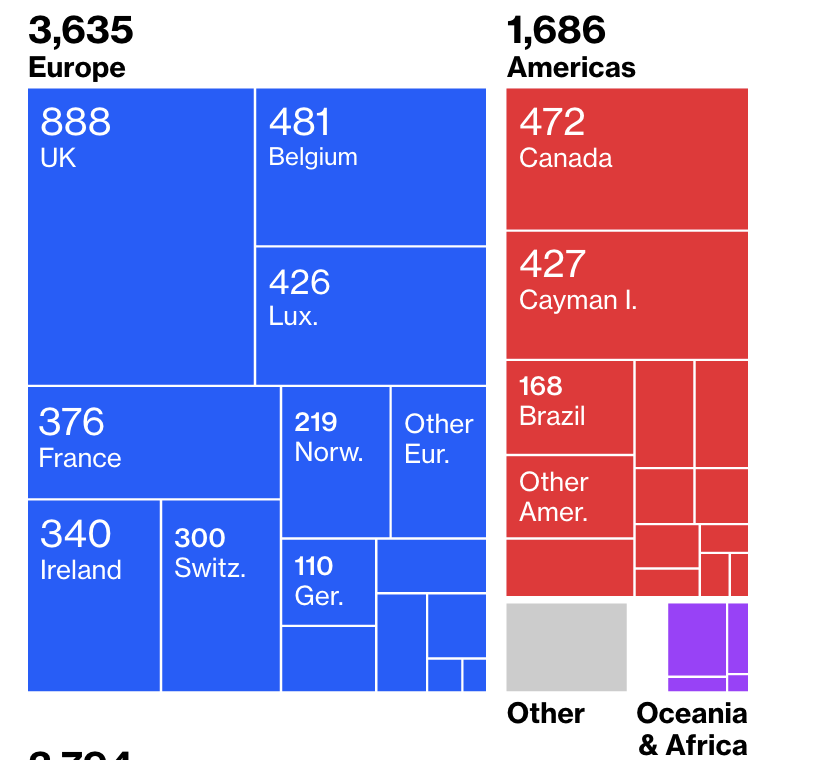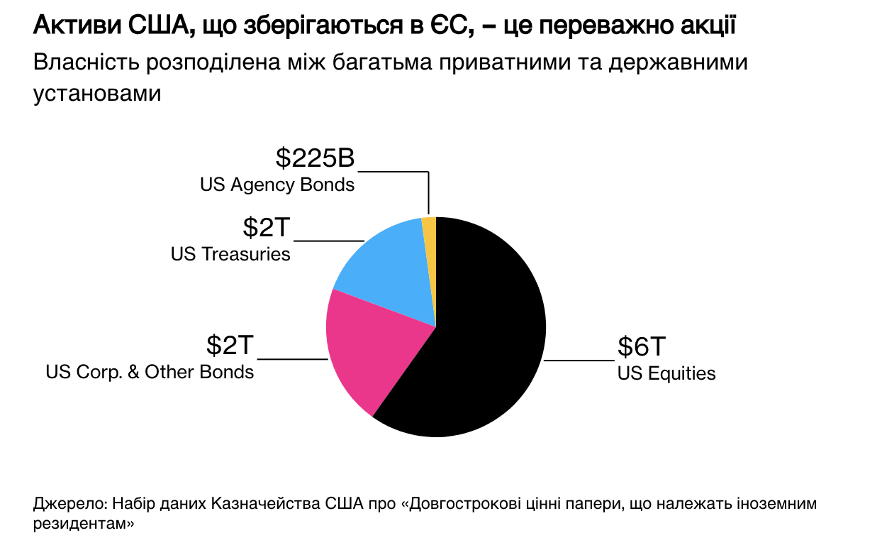 Активи США, що знаходяться в Європейському Союзі, становлять понад 10 трильйонів доларів, згідно з даними Міністерства фінансів США, причому ще більше — у Великій Британії та Норвегії.