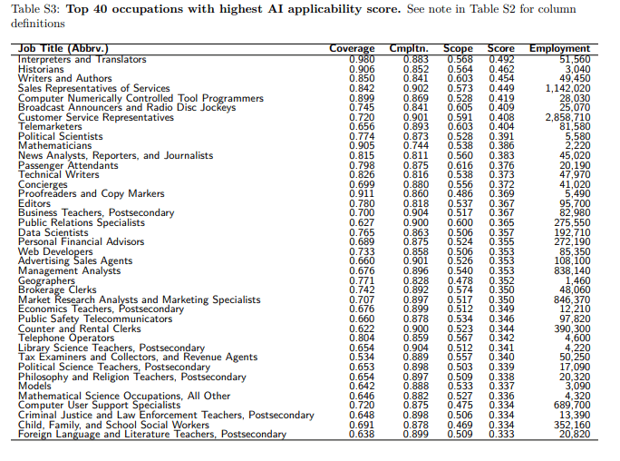 На рівні конкретних професій найвищі показники застосування ШІ зафіксовані, зокрема, у перекладачів та усних перекладачів, письменників та авторів, істориків, фахівців з обслуговування клієнтів, телемаркетологів, журналістів, технічних письменників, PR-фахівців та дата-саєністів. У всіх цих випадках вклад ШІ пов'язаний насамперед із роботою з текстами, знаннями та комунікацією.