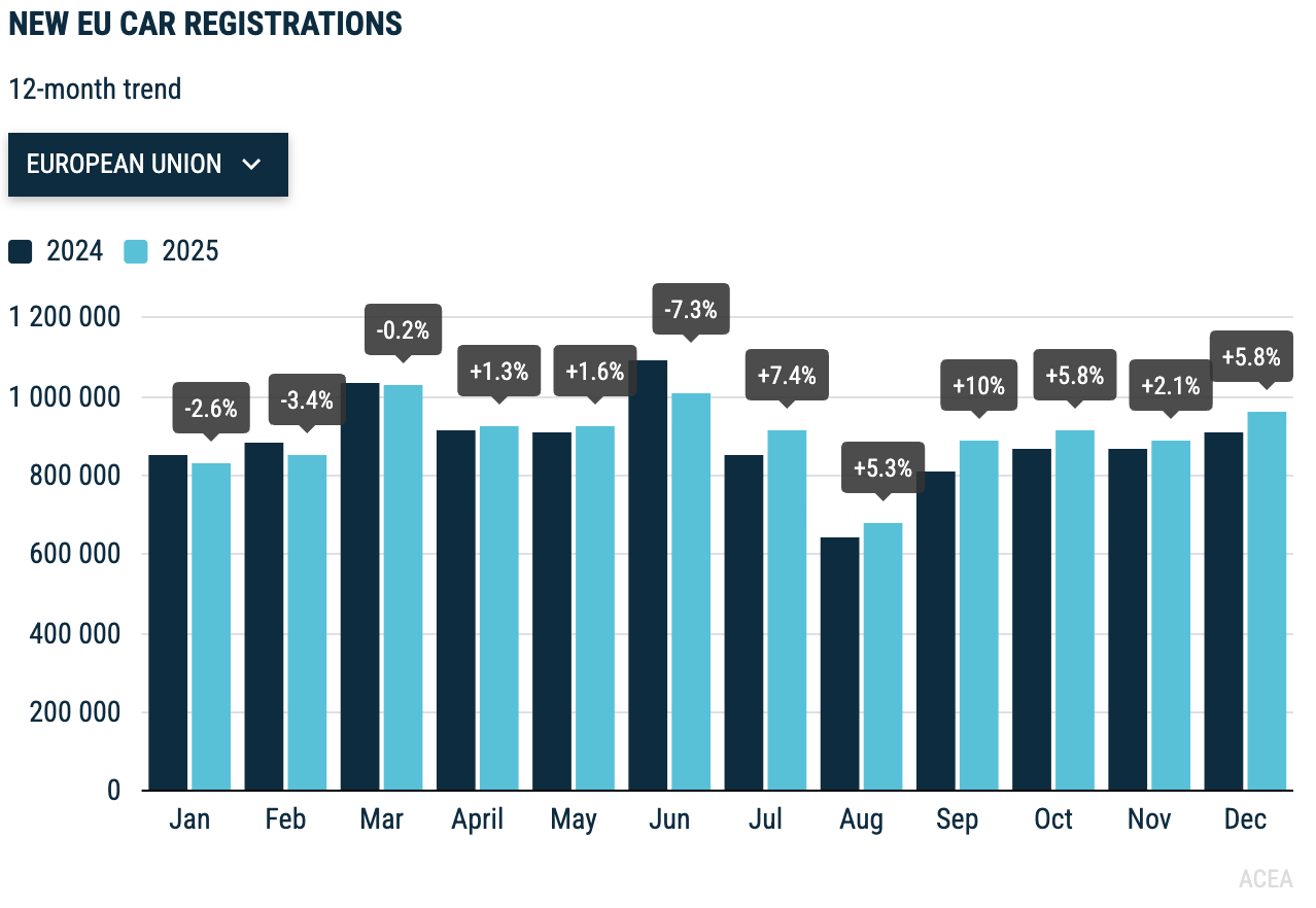 За підсумками 2025 року ринок нових автомобілів в Євросоюзі продемонстрував помірне зростання на 1,8%. Попри позитивну динаміку, загальні обсяги продажів все ще не досягли допандемійного рівня. Проте структура ринку зазнала фундаментальних змін: частка традиційних авто з ДВЗ (бензин та дизель) вперше зрівнялася з часткою гібридів. Про це свідчать дані Асоціації європейських автовиробників (ACEA).