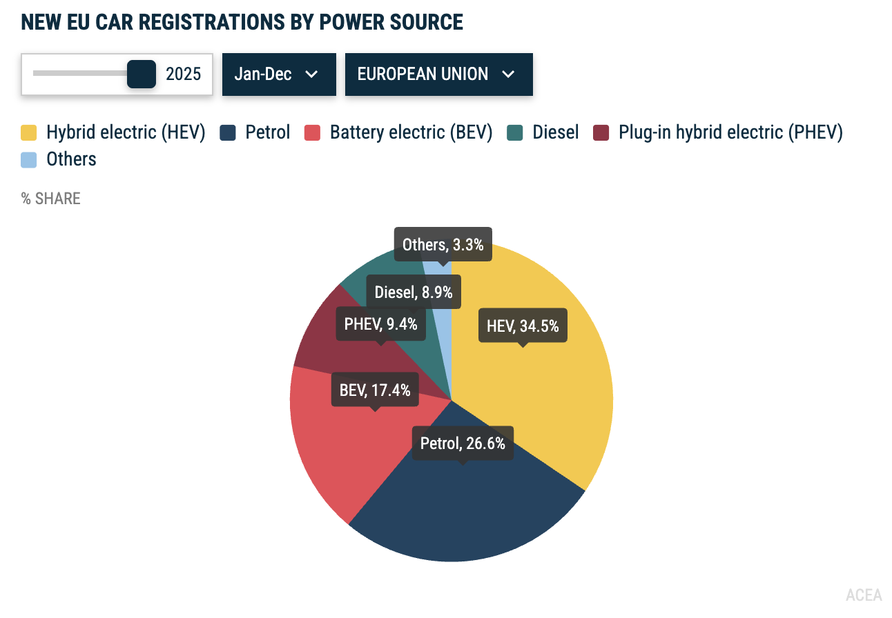 Найбільшу частку ринку нових легкових автомобілів у ЄС займають гібридні авто — 34,5%. Другу позицію посідають бензинові моделі з часткою 26,6%, а трійку лідерів замикають електромобілі, на які припадає 17,4% продажів.