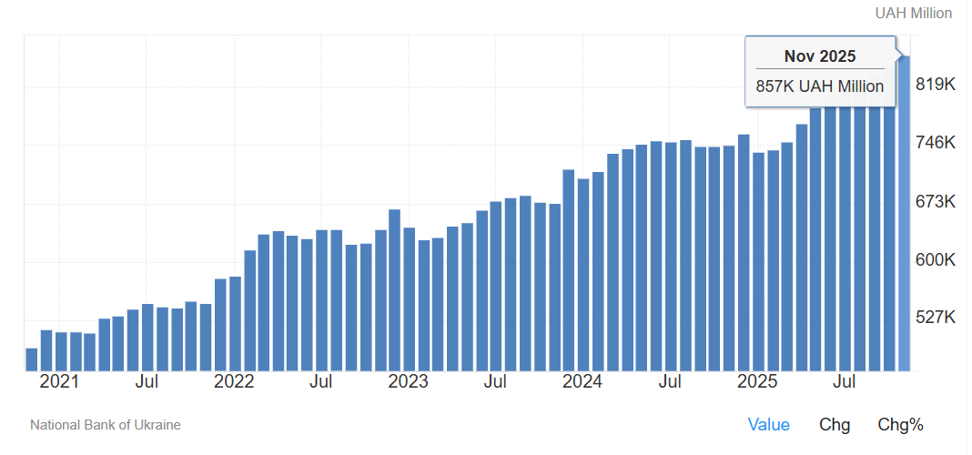 Картина стане ще цікавішою, якщо врахувати наступне. У листопаді 2025 року показник М0 (купюри та розмінна монета поза банківською системою) перебував на рівні 857,4 млрд грн. Тобто лише за грудень минулого року обсяг готівки поза банками збільшився на 68,9 млрд грн, або на понад 66% від усього приросту за рік.