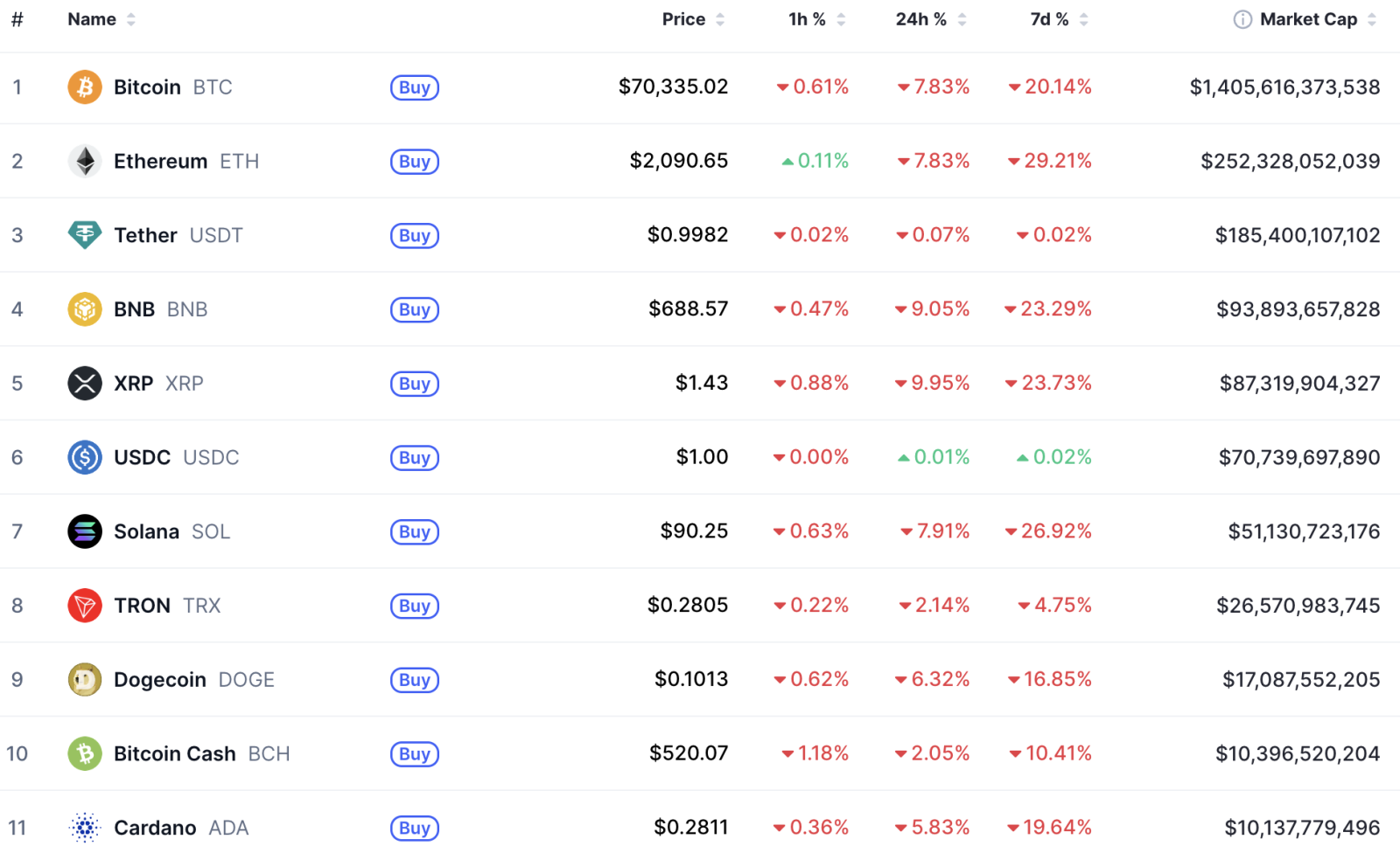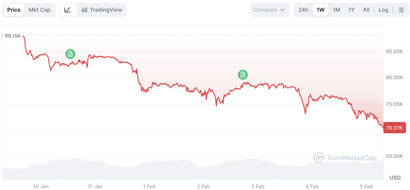 На момент написання новини ціна першої криптовалюти становить $70 335. За останні 24 години актив втратив майже 8%. При цьому тижневе падіння досягло 20%.